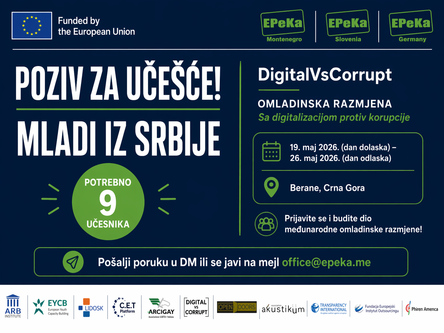 PRIJAVI SE NA OMLADINSKU RAZMJENU U BERANAMA! Pozivamo mlade iz Berana da se prijave i uzmu učešće u razmjeni. Broj mjesta je ograničen na 7 učesnika. Da li te zanimaju teme digitalnog svijeta, korupcije i kako mladi mogu napraviti promjene? Ovo je prava prilika za tebe! Berane 19. maj – 26. maj NVO Epeka organizuje omladinsku […]